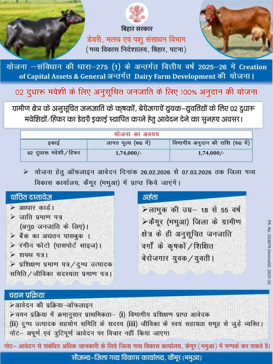 अगर आप बिहार में रहकर डेयरी फार्म खोलना चाहते हैं और सरकारी सहायता की तलाश में हैं,और आप लोन लेकर अच्छा कमाई करना चाहते है, तो आपके लिए बड़ी खुशखबरी है। बिहार पशु एवं मत्स्य संसाधन विभाग के तहत संचालित योजनाओं—जैसे गव्य विकास निदेशालय द्वारा लागू कार्यक्रम—के माध्यम से पात्र आवेदकों को ₹1.74 लाख तक की लागत वाली डेयरी यूनिट पर आकर्षक अनुदान (सब्सिडी) दिया जा रहा है। इस लेख में हम आपको योजना की पूरी जानकारी, पात्रता, आवश्यक दस्तावेज, आवेदन प्रक्रिया और लाभ विस्तार से बताएंगे, ताकि आप बिना किसी परेशानी के ऑनलाइन आवेदन कर सकें।